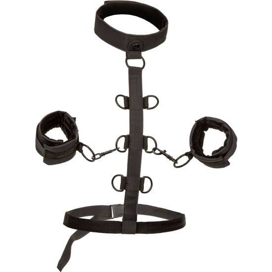 Empuje los límites del placer y abrace las posibilidades sin fin de la esclavitud con el CalExotics Boundless Collar Body Restraint. Deslícese en este atrevido sistema de restricción y explore el juego apasionado en los brazaletes universales de cuero vegano, el collar de uso pesado y la cuerda de restricción de varios niveles. Los fetichistas y los principiantes tímidos pueden disfrutar del juego apasionado al deslizarse en las restricciones malvadas y los brazaletes de cuero sintético. Una vez que hayas envuelto este collar hermosamente pecaminoso alrededor de tu cuello, tu dominante se deleitará al usar los múltiples niveles de restricción para controlar y dirigir tu placer. Los brazaletes de cuero vegano acolchados están equipados con una hebilla universal de uso pesado con un diseño giratorio para darle a tu placer un rango completo de movimiento. Además, los brazaletes desmontables se pueden usar de forma independiente para más aventuras. Incluso los más nuevos en el juego sumiso amarán la emocionante comodidad de la capa interna acolchada del collar y el diseño doblemente acolchado y doblemente cosido de los brazaletes. Traiga a la vida sus sueños eróticos más profundos y sumérjase en sus deseos más aventureros con este collar de restricción corporal sensacionalmente cómodo.