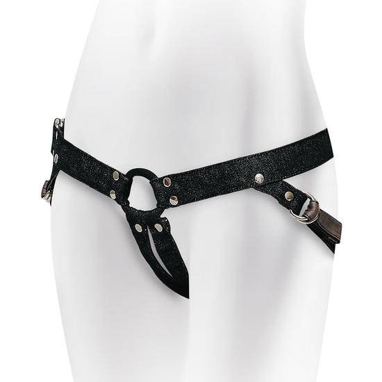 Exclusivo arnés hecho a mano fabricado en material vaquero color negro en el exterior (100% algodón) y forrado en el interior (100% algodón) con anillo hecho de silicona.