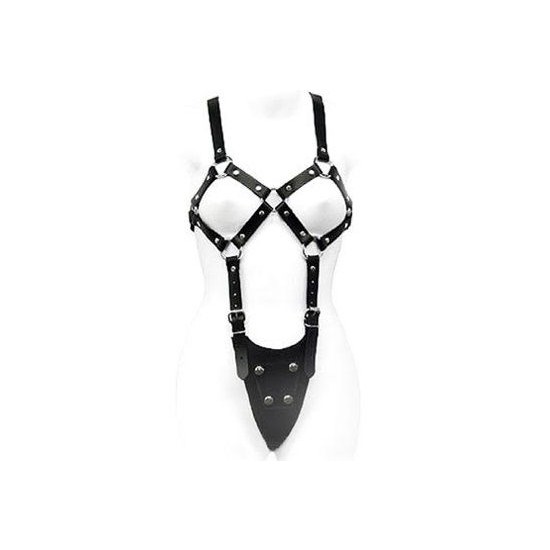Practica el BDSM, con este Arnes leather para mujer, completamente enlazado de arriba abajo y 100% ajustable.